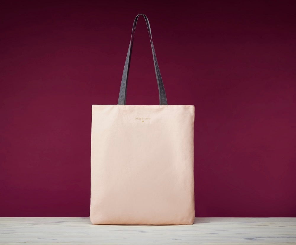 グレーのポリエステル生地とピンクベージュのコットン生地を、リバーシブルでお使いいただけるトート。