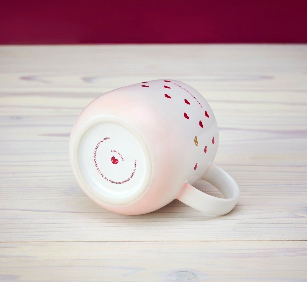 コロンとした形に、ピンクと白のグラデーションをデザインしたマグ。散りばめられたハートの中に、キラっとゴールドに光るハートのコーヒー豆がポイントになっています。コーヒーやチョコレートと一緒に、贈り物としてもおすすめです。