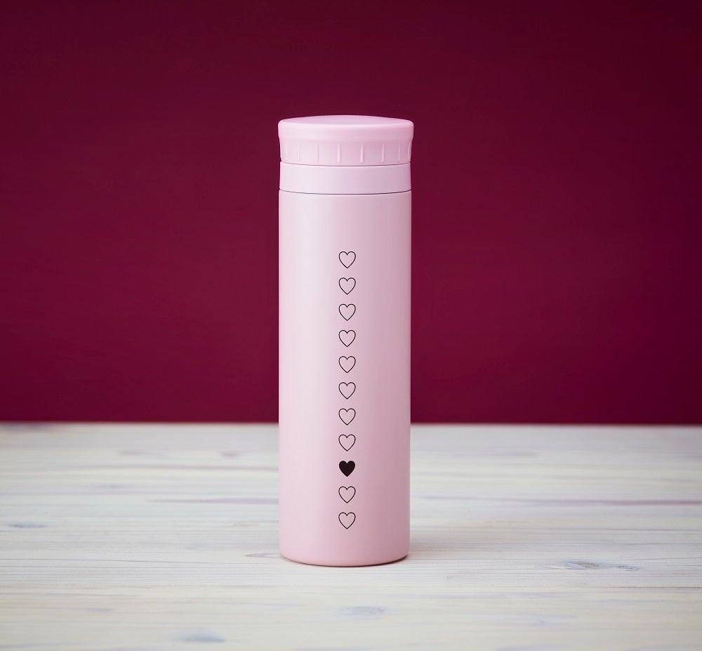コンパクトで持ち運びしやすいステンレスボトル。やさしいピンクのボディにプクっとしたハートのデザインを施した、シンプルながらアクセントのあるアイテムです。