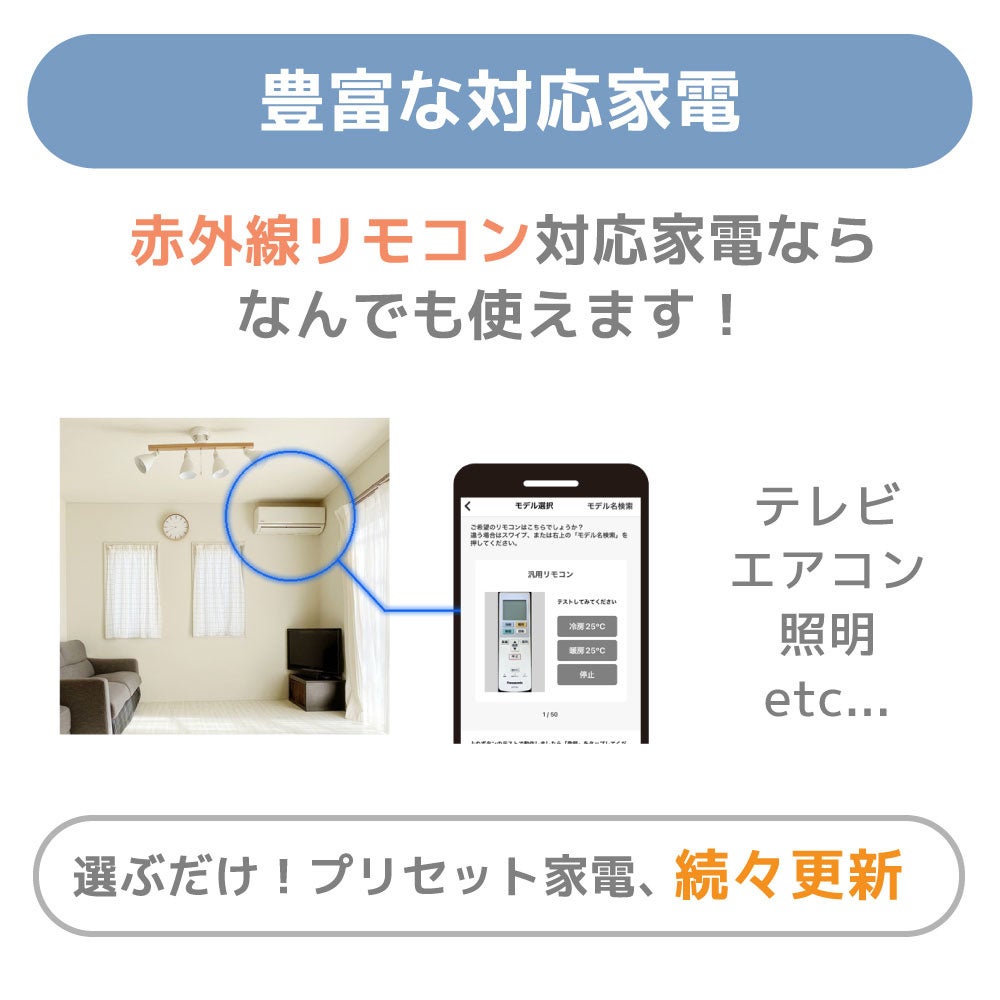 「smaliaスマートリモコン」は、スマートフォン(スマホ)やスマートスピーカーを使って家電を操作するためのデバイスです。複数ある家電のリモコンを一つのアプリにまとめることができ、外出先からでも操作することが可能です。赤外線リモコンで動作する家電であれば、どんな家電でもスマート化できます。アプリには、国内主要メーカーの赤外線リモコンデータを750機種以上プリセットしているため、直感的にアプリ上でのリモコン選択ができ、簡単に家電登録ができます。赤外線の飛距離は見通し最大25mのため、広めのリビングに置いてもしっかり届きます。また、本体は壁掛け、平置きの両方に対応し、小型で主張しないデザインのため、見通しのいい場所に設置してもインテリアになじみます。