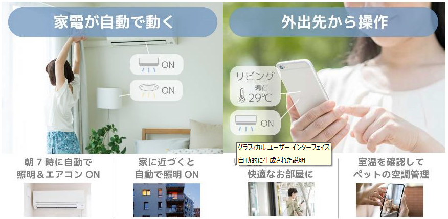 家電を自動でコントロールしたり、外出先から操作をしたり、「おやすみ」のひとことで照明とエアコンをオフにするなど、さまざまな条件でシーン設定することが可能です。