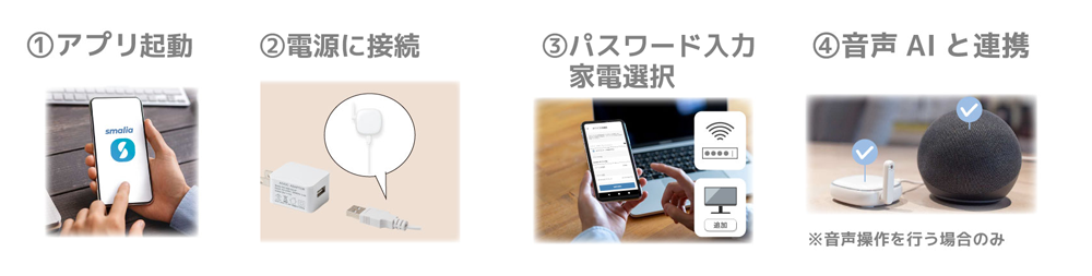 また、smaliaアプリは、Wi-Fi接続から家電の選択、スマートスピーカー連携までストレスなく進められるよう、シンプルな手順で設定いただけます。