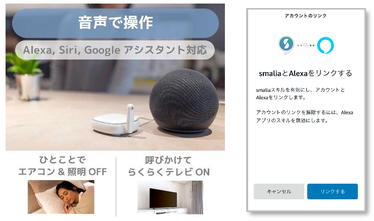 Amazon Alexa、Googleアシスタント、Siriショートカットに対応しているため、スマートスピーカーやスマホに話しかけて、家電をコントロールすることができます。smaliaはAlexaのアプリ間アカウントリンクにも対応しており、画面のタップだけでスムーズな連携ができます。