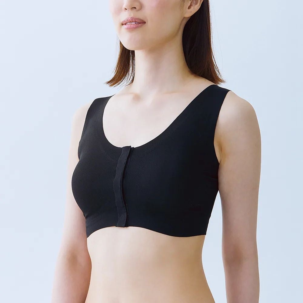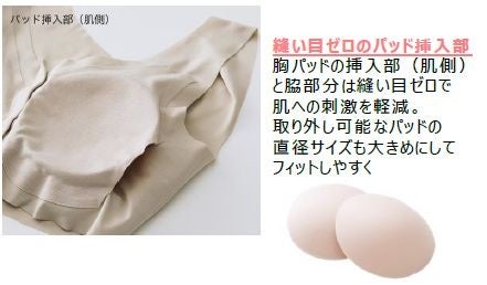 「メディキュア」の前あきハーフトップは、患者さまや看護師の方の「あったらうれしい」のお声から生まれた商品で、2017年5月から販売を開始しました。前あきデザインなので、乳がん手術後に多い「腕を後ろに回しにくい」「腕が上がりにくい」場合や診察時もスムーズに着脱できます。また、手術後に敏感になりがちなお肌のために、やわらかな 綿混素材を使用するとともに、ネックライン、脇、アンダーバスト部をきりっぱなしで仕上げ、縫い目によるお肌への刺激を軽減しています。この度発売した「さらっとタイプ」は接触冷感の素材を使用しているので、薄くて軽い着け心地に 加え、肌に触れたときのひんやり感が気持ちよく、手術後や治療に伴うホットフラッシュ対策にもおすすめの商品です。お客さまのお声をもとに、綿混タイプよりも挿入パッドの直径を少し大きくして、フィットしやすい形にしました。また、スナップボタンの数も1つ減らして、留め外しも軽くなりました。