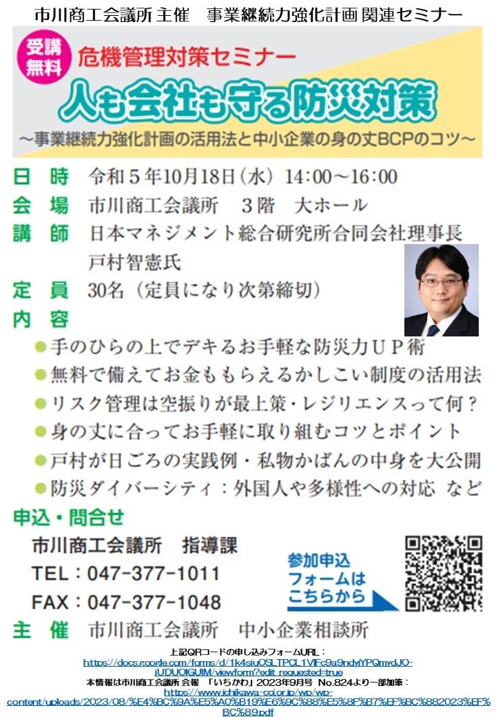 「人も会社も守る防災対策:事業継続力強化計画の活用法と身の丈BCPのコツ」2023年10月18日(水)@千葉県市川市にて戸村智憲が登壇致します【日本マネジメント総合研究所合同会社】