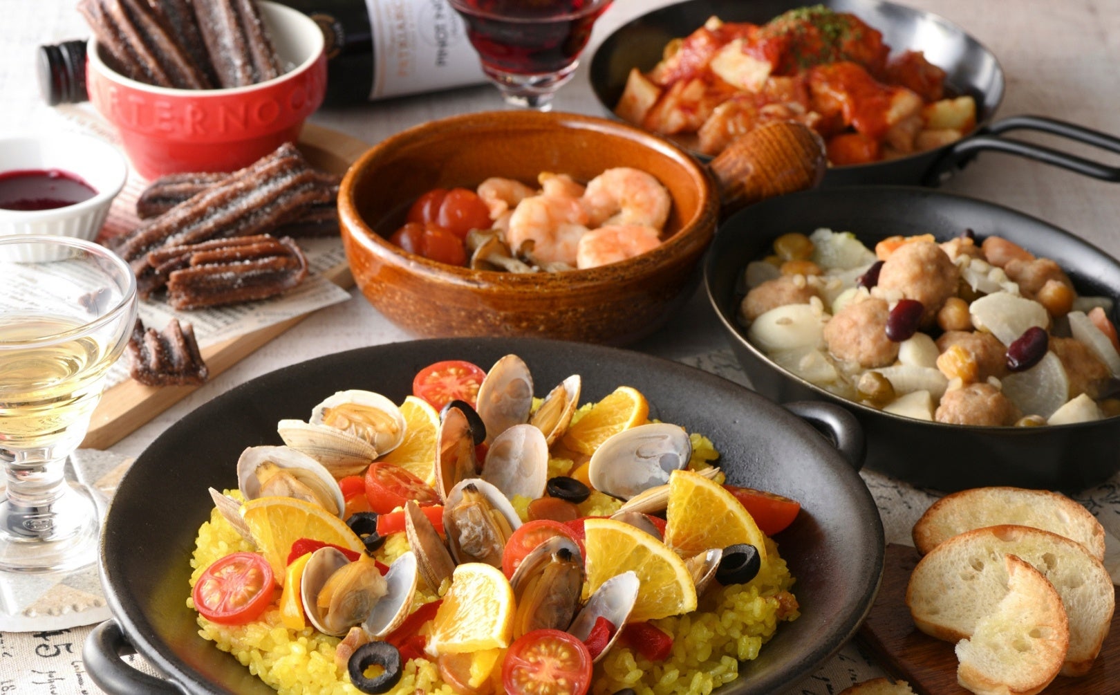 スペイン料理の大定番!あさりに鶏肉・野菜の旨みが香り立つ『パエリア』や、オーダーメニューでは、にんにくの香りが食欲をそそる『海老のアヒージョ』、スペイン発祥のスイーツ!カリモチ食感の『チョコチュロス』など、スペインのグルメもご堪能いただけます!