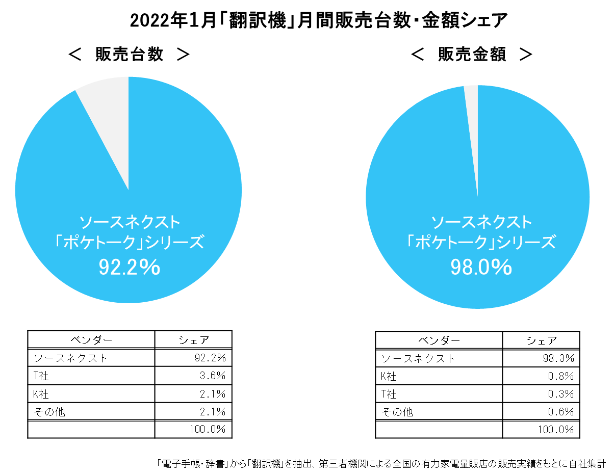 ソースネクスト株式会社(本社:東京都港区東新橋1-5-2 汐留シティセンター33階 代表取締役社長:小嶋 智彰)は、弊社の100%子会社であるポケトーク株式会社が販売するAI通訳機「POCKETALK®(ポケトーク)」シリーズの2022年1月の翻訳機市場でのシェアが、販売台数で92.2%(対前月比、変動なし)、販売金額で98.0%(対前月比、1.0ポイント増)となったことをお知らせいたします。いずれも2017年12月の初代モデルの販売開始から50カ月連続で第1位を獲得しています。