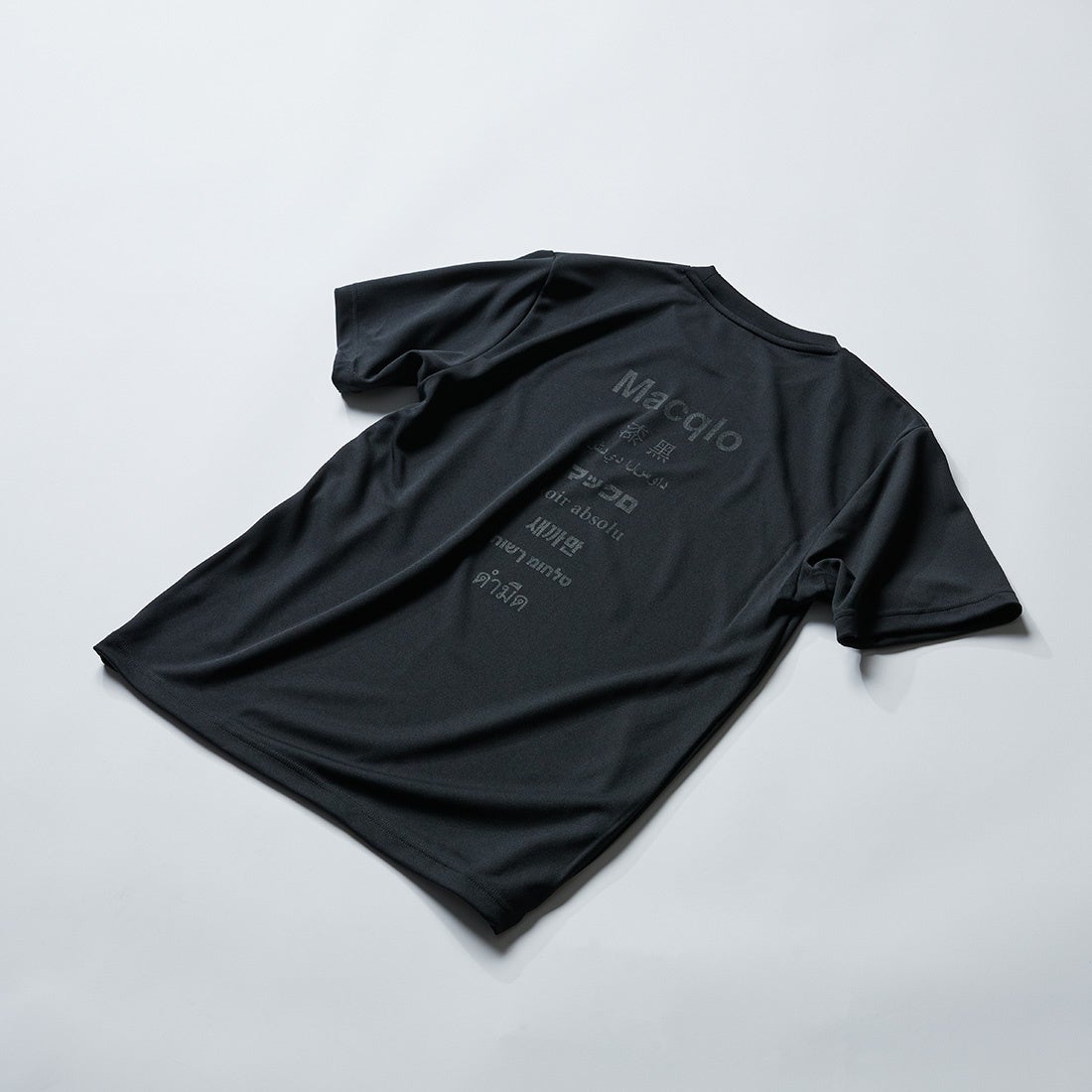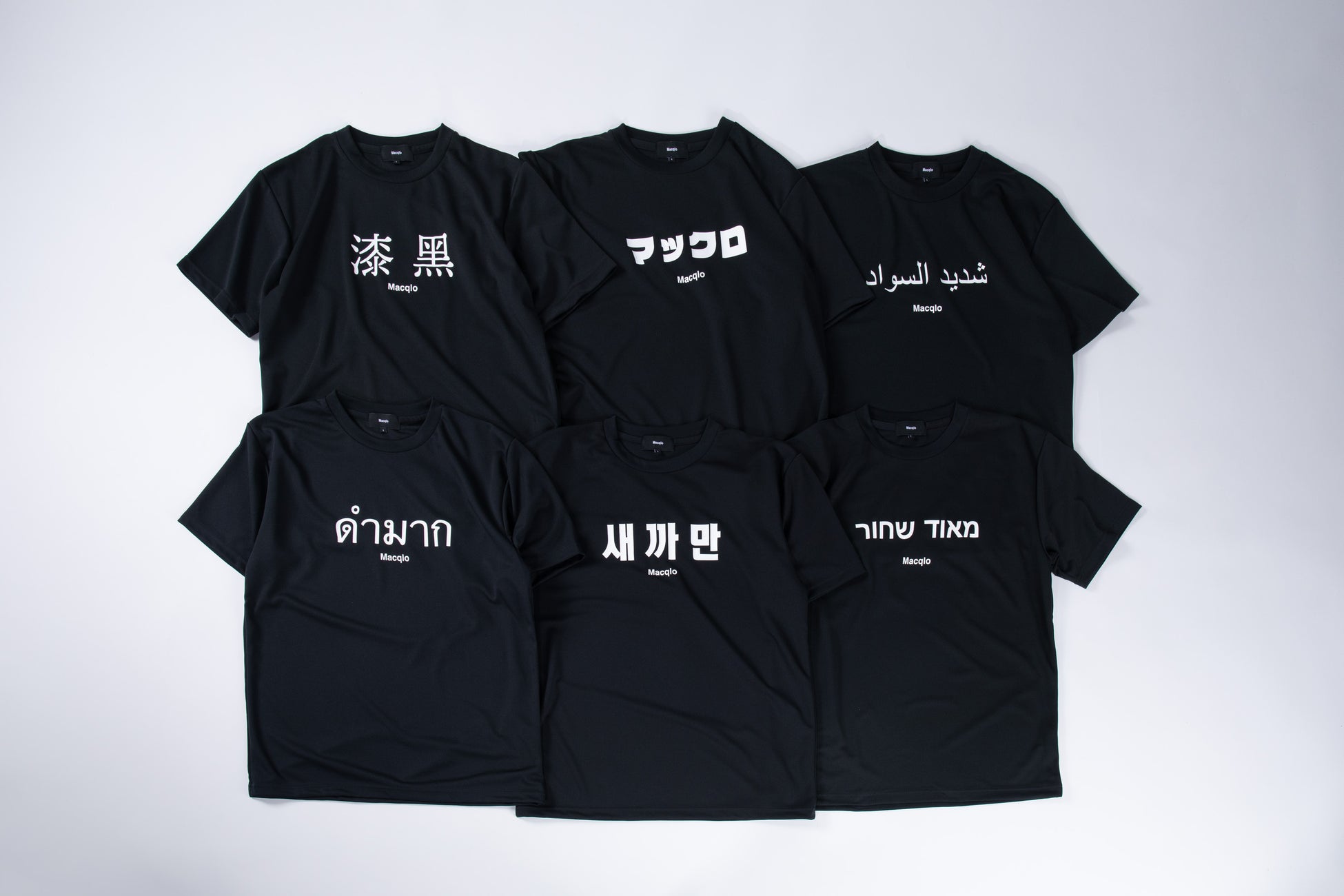 特徴:日本・韓国・中国・アラビア・タイ・ヘブライの6つの言語で「真っ黒」とプリントされたTシャツ。裏地がメッシュ生地になっており、抜群の吸汗性と綿の2倍以上の速乾性があります。UVカット、洗濯可能。