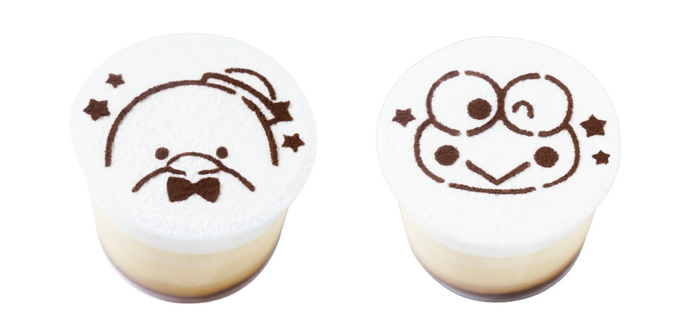パステルオリジナルのミニプリンにホイップクリームをのせ、仕上げにココアパウダーでタキシードサムとけろけろけろっぴのイラストを描いたプリンです。