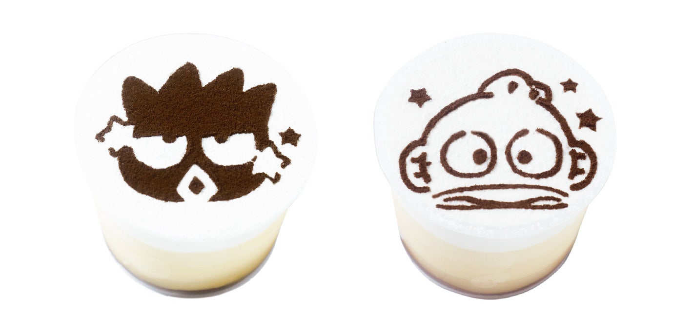 パステルオリジナルのミニプリンにホイップクリームをのせ、仕上げにココアパウダーでバッドばつ丸とハンギョドンのイラストを描いたプリンです。