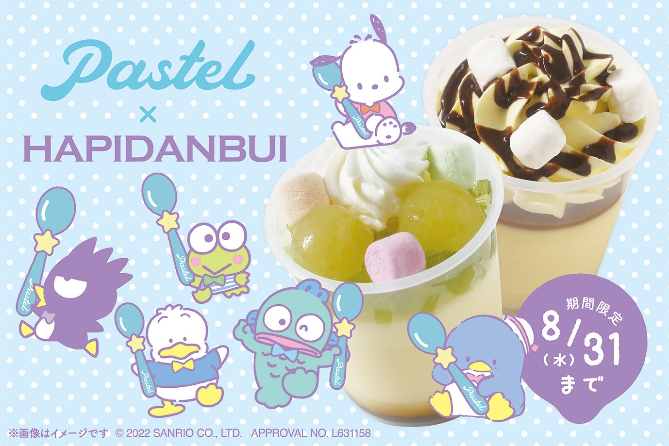 全国にベーカリー&パティスリーを展開する株式会社オールハーツ・カンパニー(本社:名古屋市中区、代表:四方田 豊)が運営する“なめらかプリン”でおなじみのスイーツブランド「Pastel(パステル)」は、2022年7月1日(金)〜2022年8月31日(水)までの期間中、株式会社サンリオの人気キャラクターユニット「はぴだんぶい」とのコラボ商品を販売いたします。