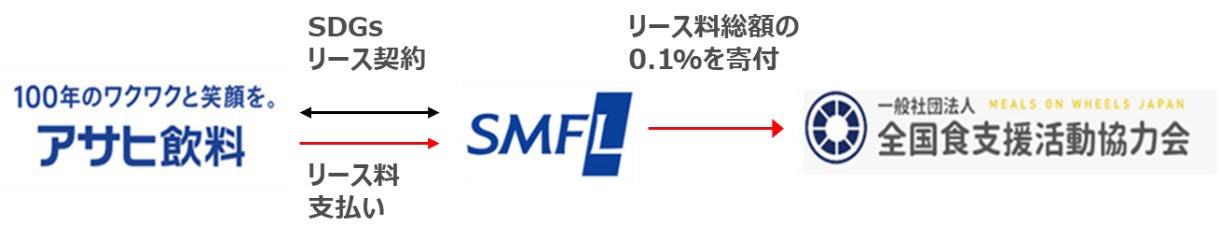 本取り組みは、アサヒ飲料の自動販売機を対象にSMFLが提供する新規リース取引について、リース料の0.1%を一般社団法人全国食支援活動協力会に寄付するものです。今回の寄付金は同会を通じて「こども食堂」などの食支援活動を継続的に実施できる環境を整えるための仕組みづくりに活用されます。アサヒ飲料として、自動販売機のリース料を活用した寄付は初となります。