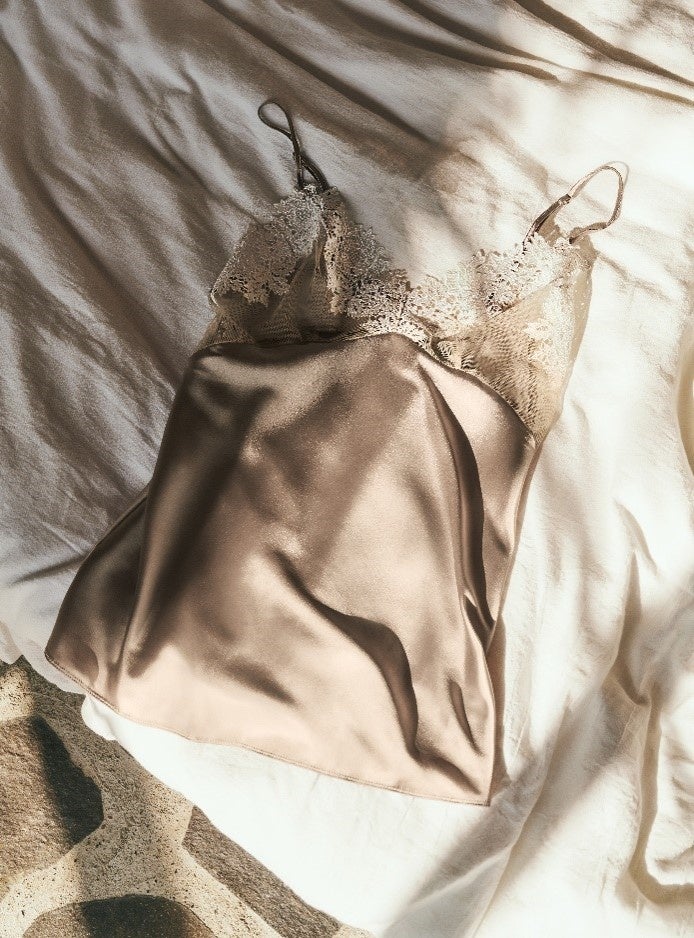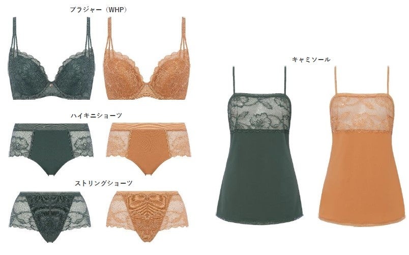 キャミソールの胸元や、ショーツのサイドなど、透明感にあふれるストレッチリバーレースの繊細さで、インポートライクな軽やかさを表現したシリーズです。肌に溶け込むようなシルキーななめらかさで、より日常使いしていただきやすいデザインに仕上げました。モチーフは丸みのあるシルエットが愛らしいラナンキュラスの花。ダークグリーンと明るいテラコッタブラウンが、シック&スタイリッシュなムードです。