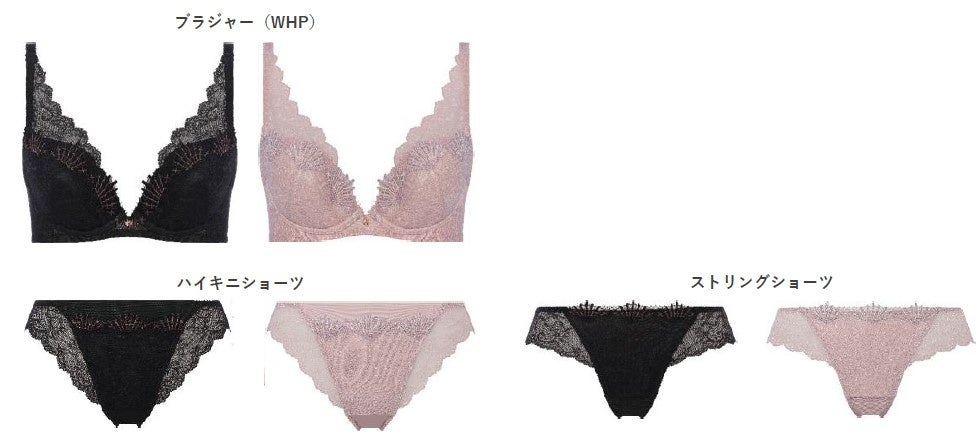 歴史あるクチュールメゾンのジュエリーのような、存在感のあるレース使いが印象的なシリーズ。アールデコ調に、クラシカルモダンに仕上げました。チュール刺しゅうとストレッチリバーレースのコンビネーションが贅沢な印象。背部には、ストレッチリバーレースをふんだんに使用しています。カラーは、シックなブラックとスモーキーなラベンダーの2色展開です。