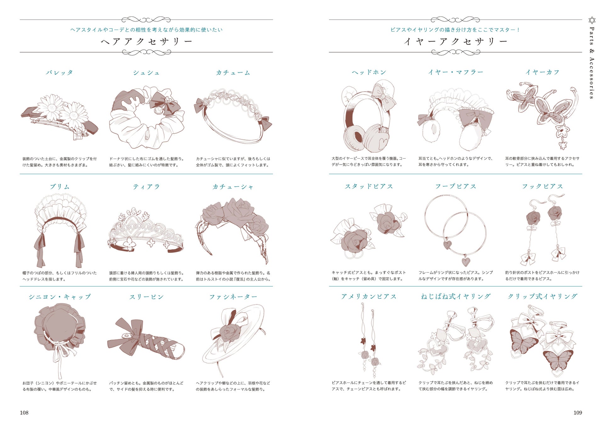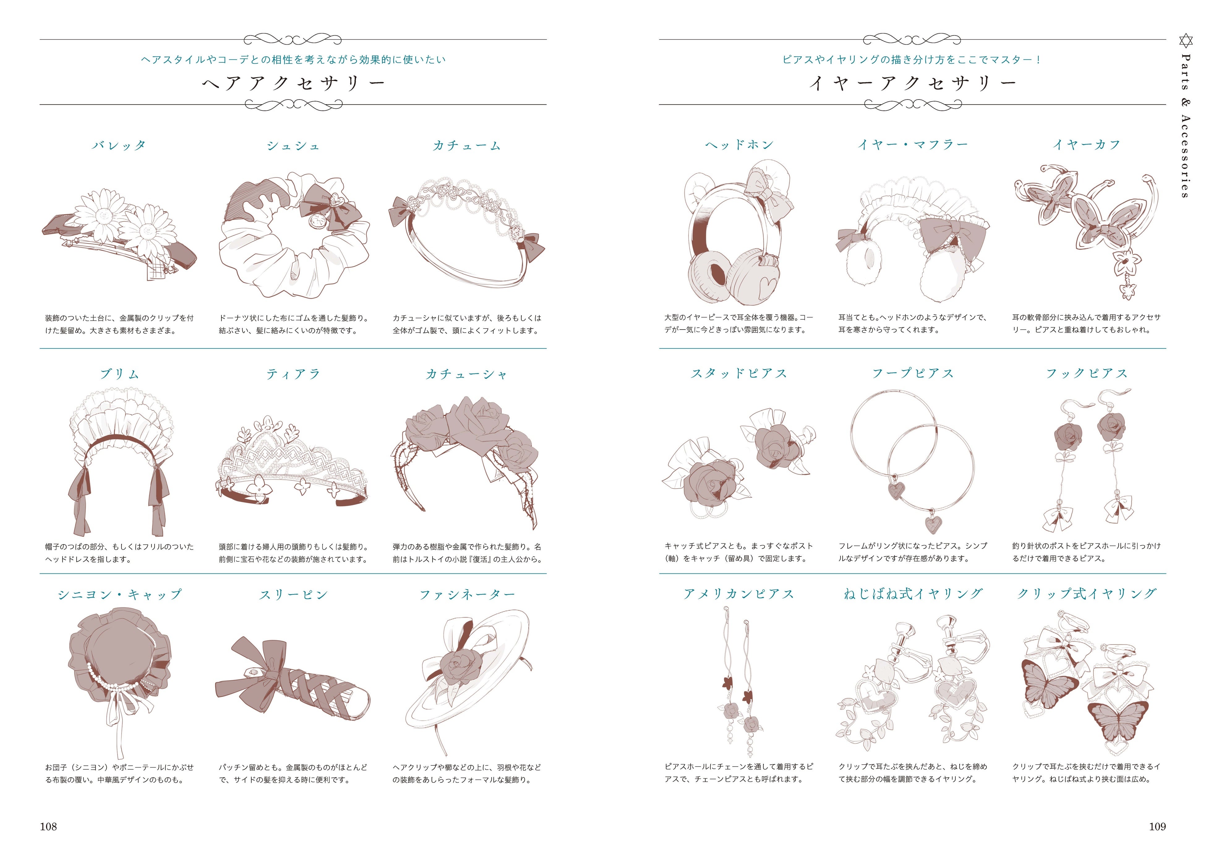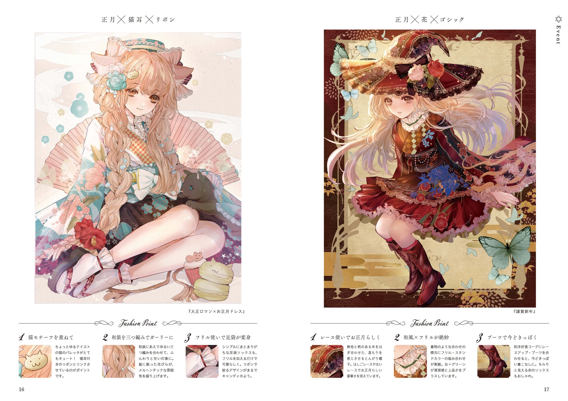 そのほか、メイキングやコラムで、洋服やアクセサリーの素材の質感を出す描き方や背景デザインのアイデア、モチーフのかけ合わせ方のコツなど多数紹介!