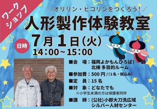 (公社)小郡大刀洗広域シルバー人材センターによるオリリン・ヒコリンの人形作りワークショップを福岡県庁11階・物産観光展示室「福岡よかもんひろば」とイオン小郡ショッピングセンターで開催!もうすぐ七夕。自分で作った人形をおうちに飾ったり、大切な人へプレゼントしたりしてみませんか。