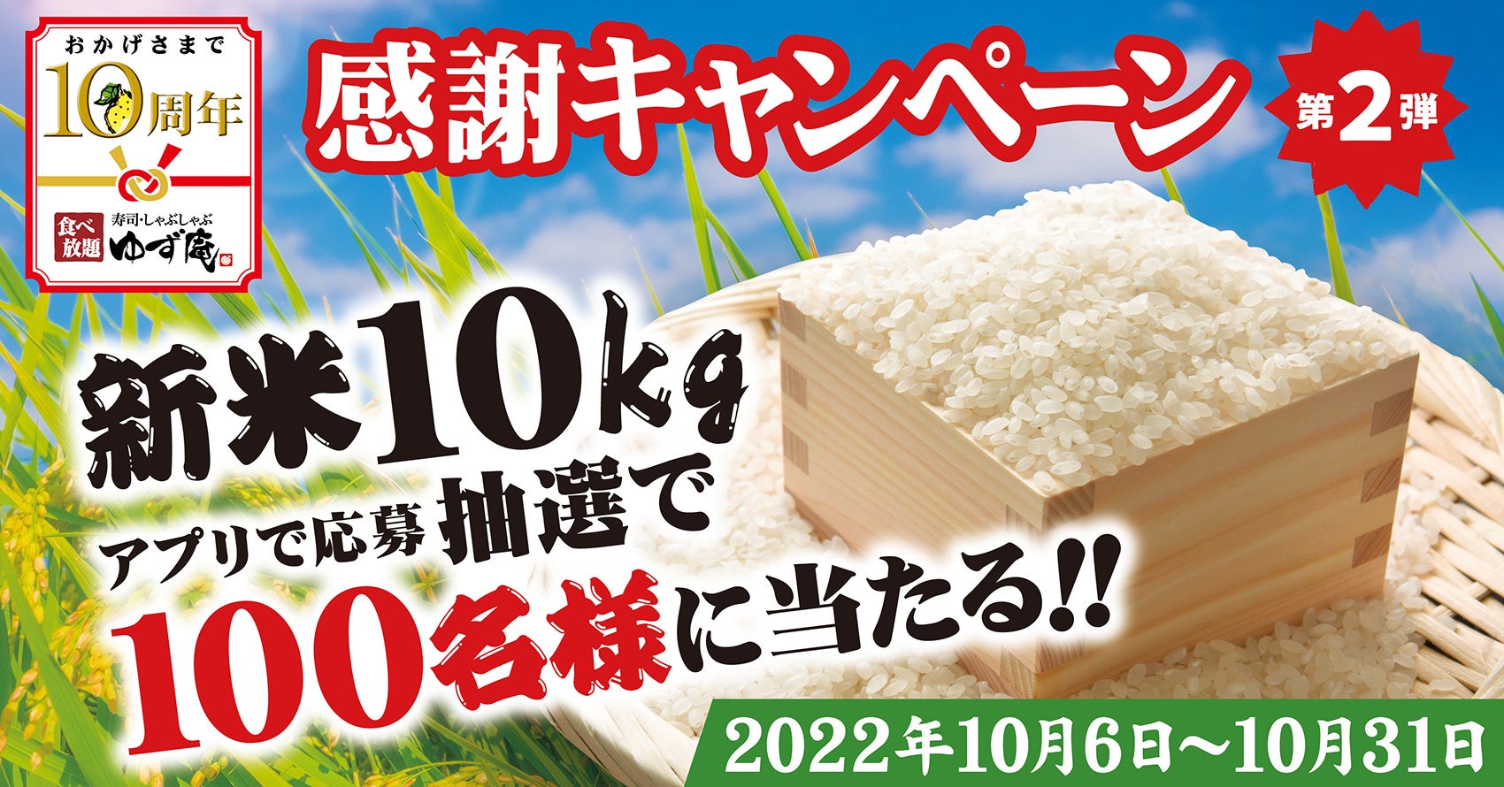 株式会社物語コーポレーション(本社:愛知県豊橋市/代表取締役社長:加藤 央之)が全国94店舗展開する「寿司・しゃぶしゃぶ ゆず庵」(以下、ゆず庵)は、おかげさまで今年で創業10周年を迎えます。これを記念して、2022年10月6日(木)から10月31日(月)まで、アプリ会員様の中から抽選で新米10kgなどが当たる、「アプリで応募 10周年記念キャンペーン」を開催いたします。