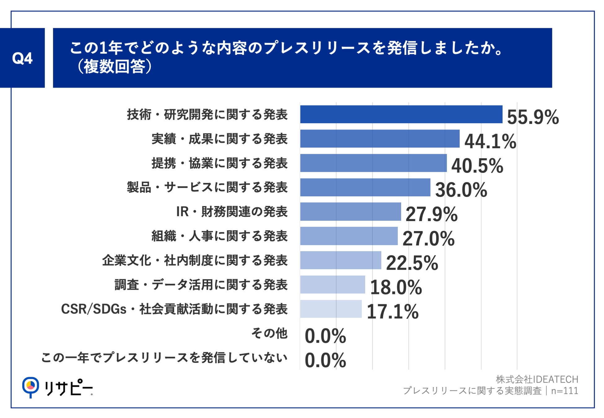 「Q4.この1年でどのような内容のプレスリリースを発信しましたか。(複数回答)」(n=111)と質問したところ、「技術・研究開発に関する発表」が55.9%、「実績・成果に関する発表」が44.1%、「提携・協業に関する発表」が40.5%という回答となりました。