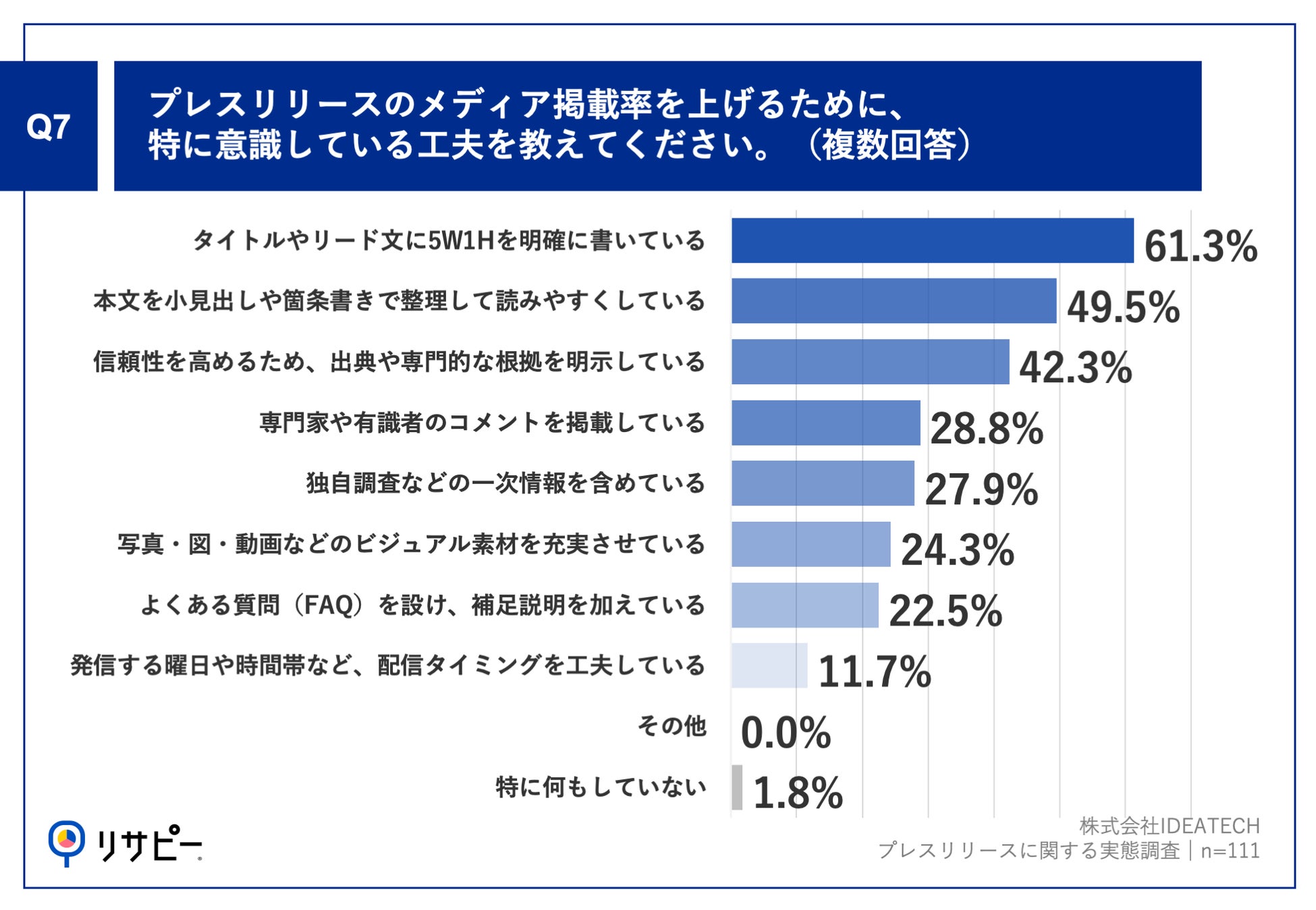 「Q7.プレスリリースのメディア掲載率を上げるために、特に意識している工夫を教えてください。(複数回答)」(n=111)と質問したところ、「タイトルやリード文に5W1Hを明確に書いている」が61.3%、「本文を小見出しや箇条書きで整理して読みやすくしている」が49.5%、「信頼性を高めるため、出典や専門的な根拠を明示している」が42.3%という回答となりました。