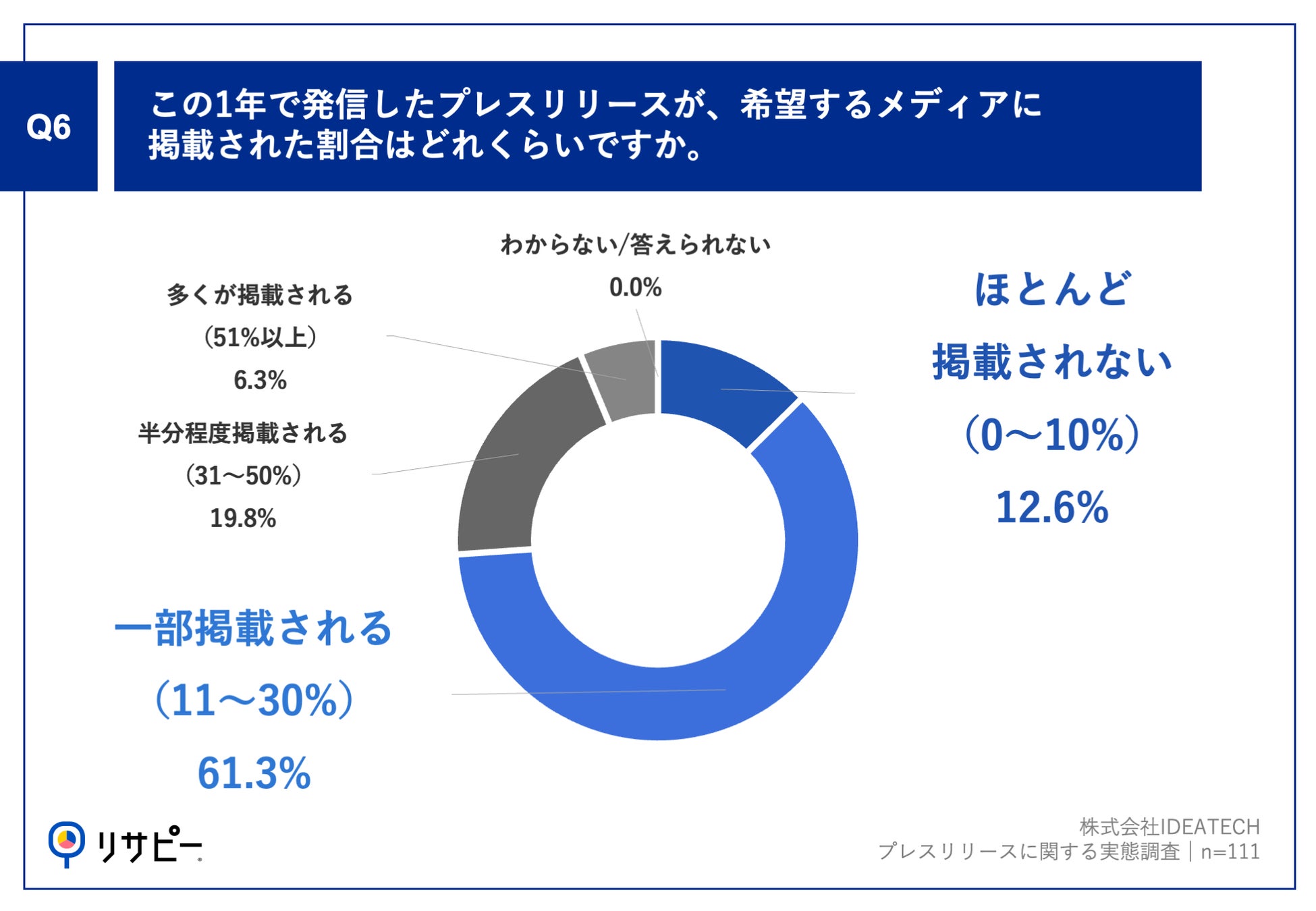 「Q6.この1年で発信したプレスリリースが、希望するメディアに掲載された割合はどれくらいですか。」(n=111)と質問したところ、「一部掲載される(11~30%)」が61.3%、「半分程度掲載される(31~50%)」が19.8%、「ほとんど掲載されない(0~10%)」が12.6%という回答となりました。