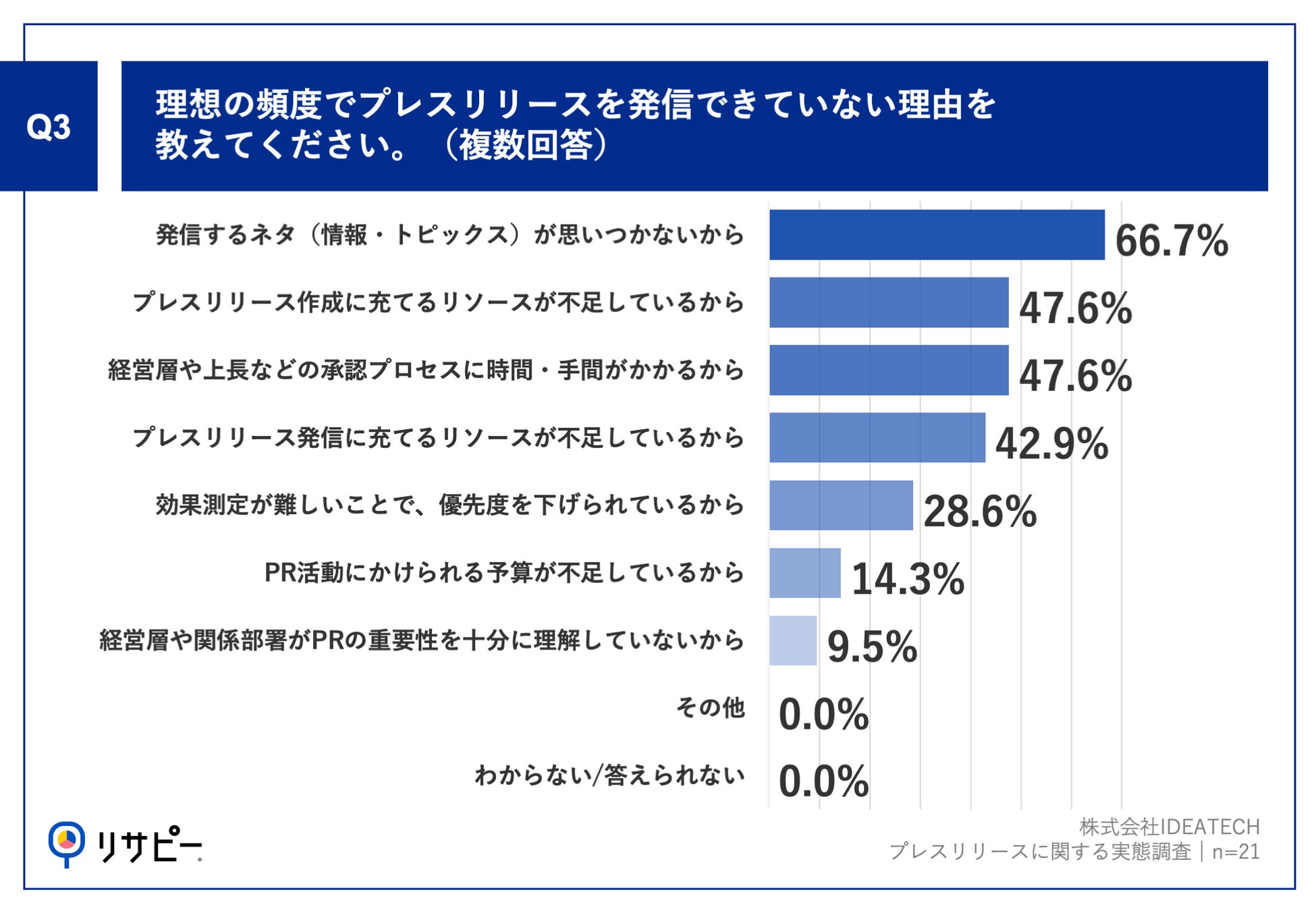 Q2で「できていない」と回答した方に、「Q3.理想の頻度でプレスリリースを発信できていない理由を教えてください。(複数回答)」(n=21)と質問したところ、「発信するネタ(情報・トピックス)が思いつかないから」が66.7%、「プレスリリース作成に充てるリソースが不足しているから」が47.6%、「経営層や上長などの承認プロセスに時間・手間がかかるから」が47.6%という回答となりました。