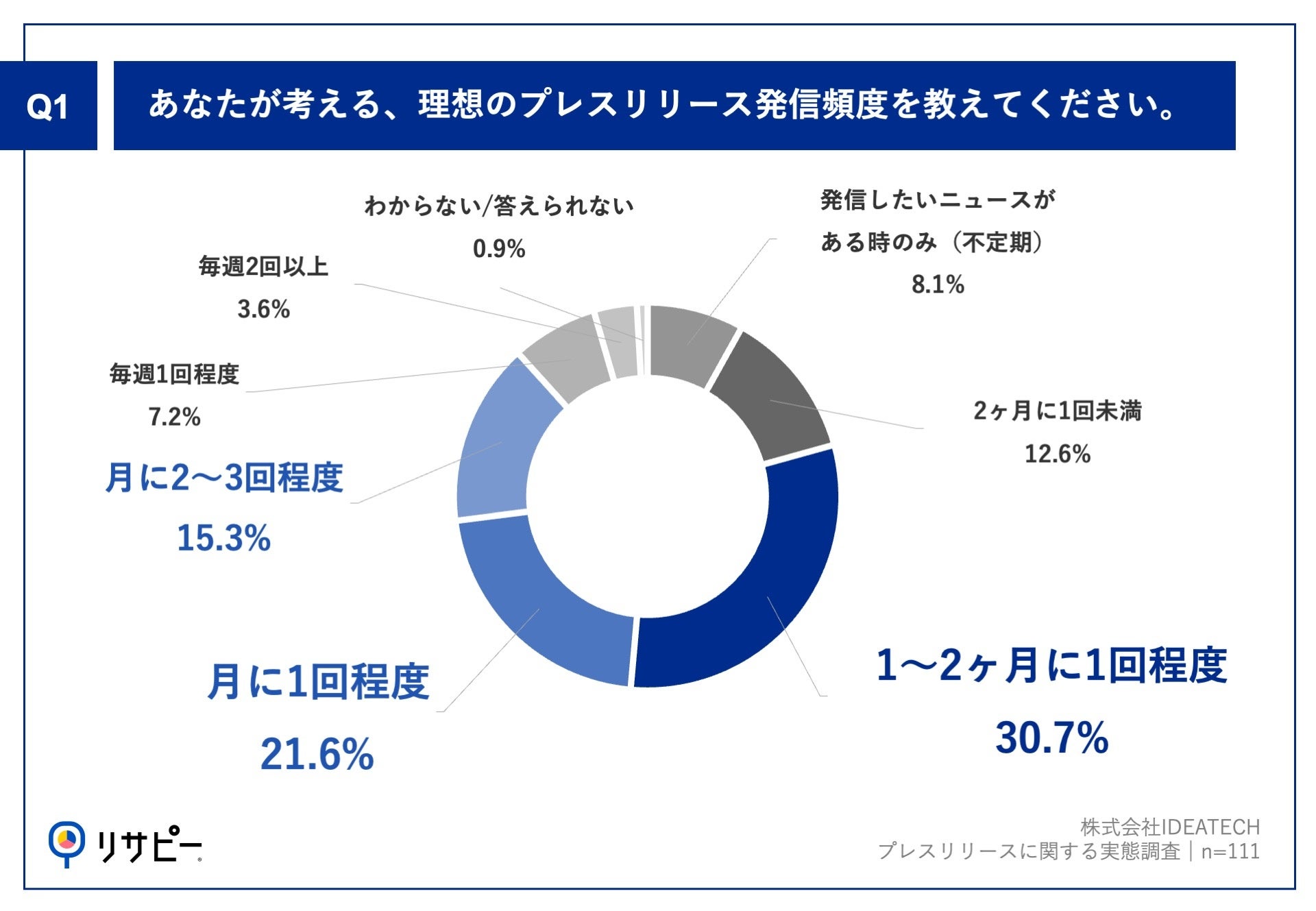 「Q1.あなたが考える、理想のプレスリリース発信頻度を教えてください。」(n=111)と質問したところ、「1~2ヶ月に1回程度」が30.7%、「月に1回程度」が21.6%、「月に2~3回程度」が15.3%という回答となりました。