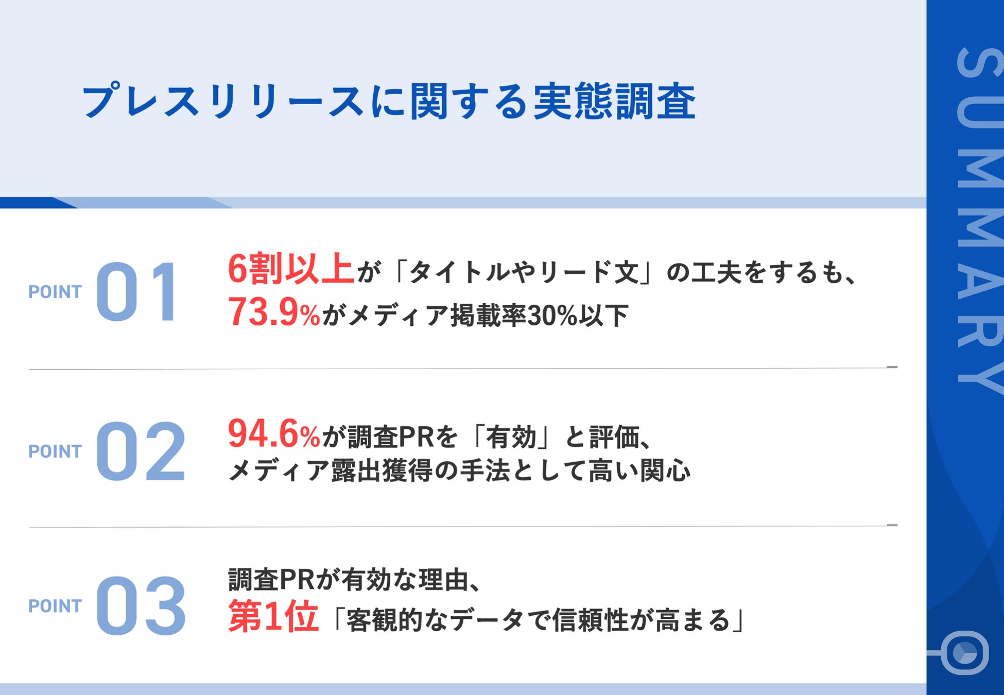 今回の調査では、多くの企業がプレスリリースのメディア掲載率の低さやネタ不足に課題を抱えている一方で、調査PRに対する高い期待が明らかになりました。特に、客観的なデータによる信頼性向上や、新しい切り口での話題づくりが重視されており、企業の広報・PR活動において、リサーチデータを活用したコンテンツマーケティングの重要性が高まっていると言えるでしょう。