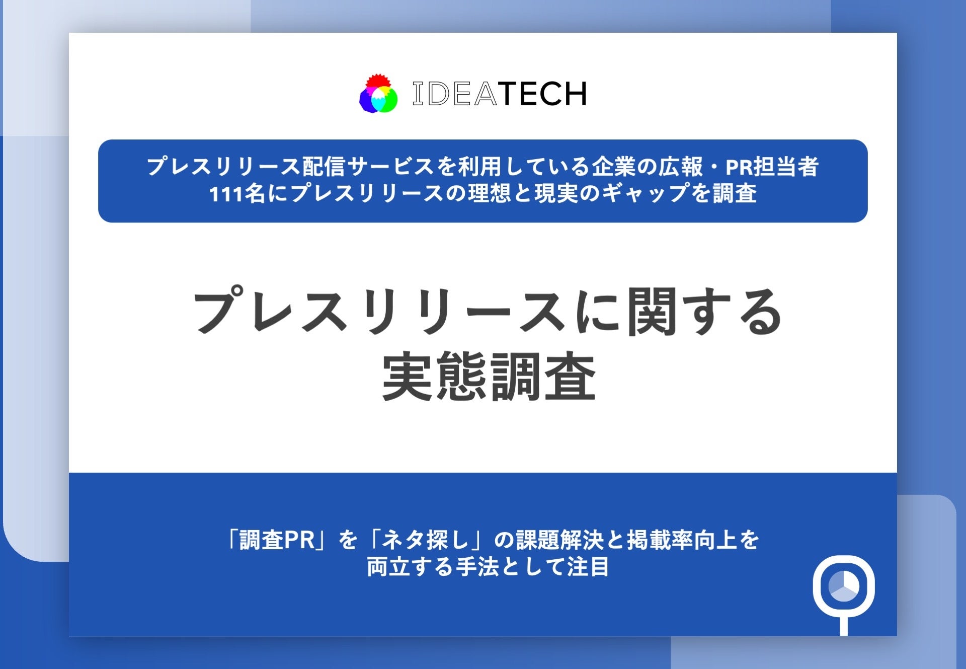 ワンストップでリサーチマーケティングを実現する「リサピー®」(https://ideatech.jp/service/research-pr)を運営する株式会社IDEATECH(本社:東京都港区、代表取締役社長:石川友夫)は、プレスリリース配信サービスを利用している企業の広報・PR担当者111名を対象に、プレスリリースに関する実態調査を実施しましたので、お知らせいたします。