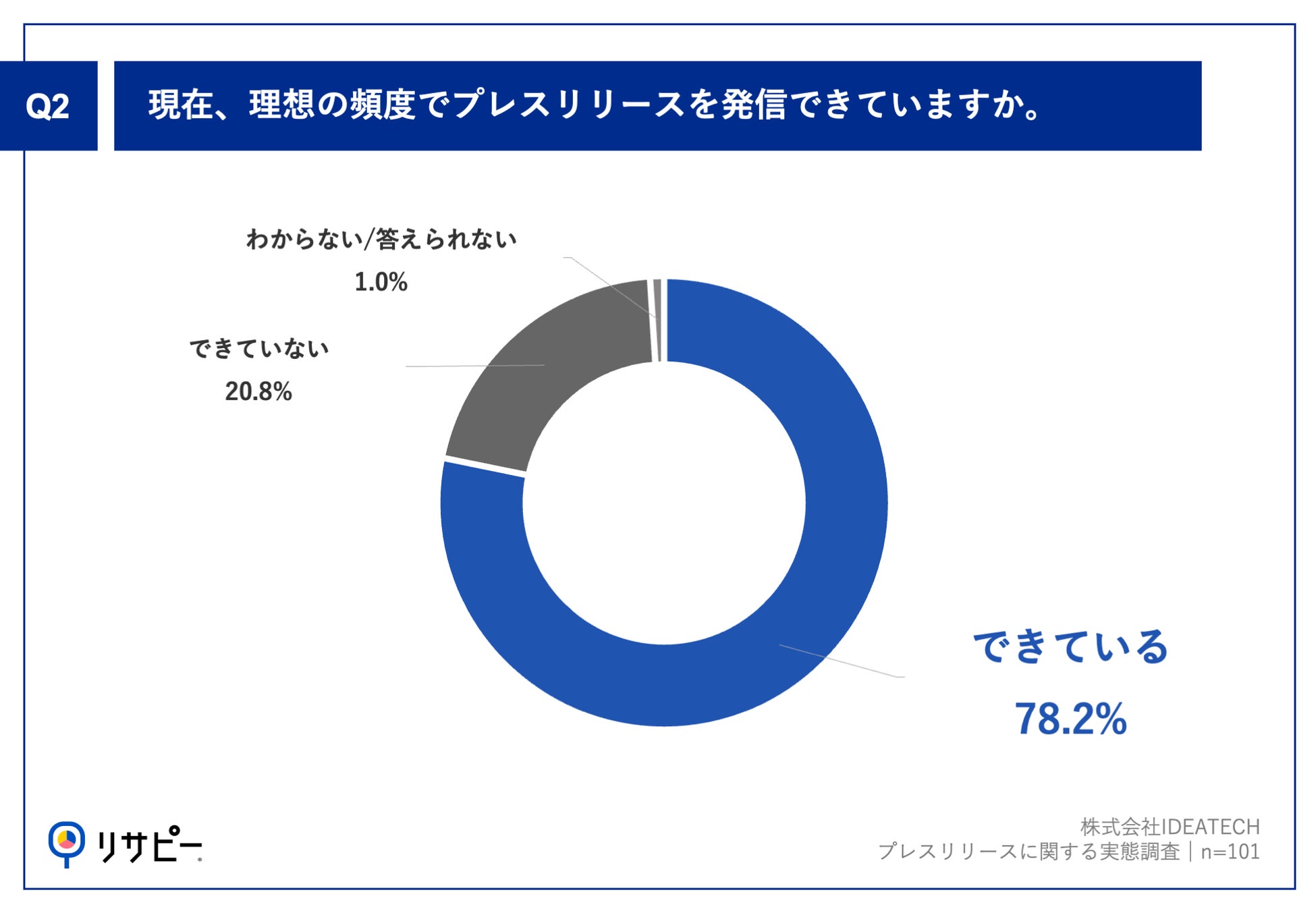 Q1で「発信したいニュースがある時のみ(不定期)」、「わからない/答えられない」以外を回答した方に、「Q2.現在、理想の頻度でプレスリリースを発信できていますか。」(n=101)と質問したところ、「できている」が78.2%、「できていない」が20.8%という回答となりました。