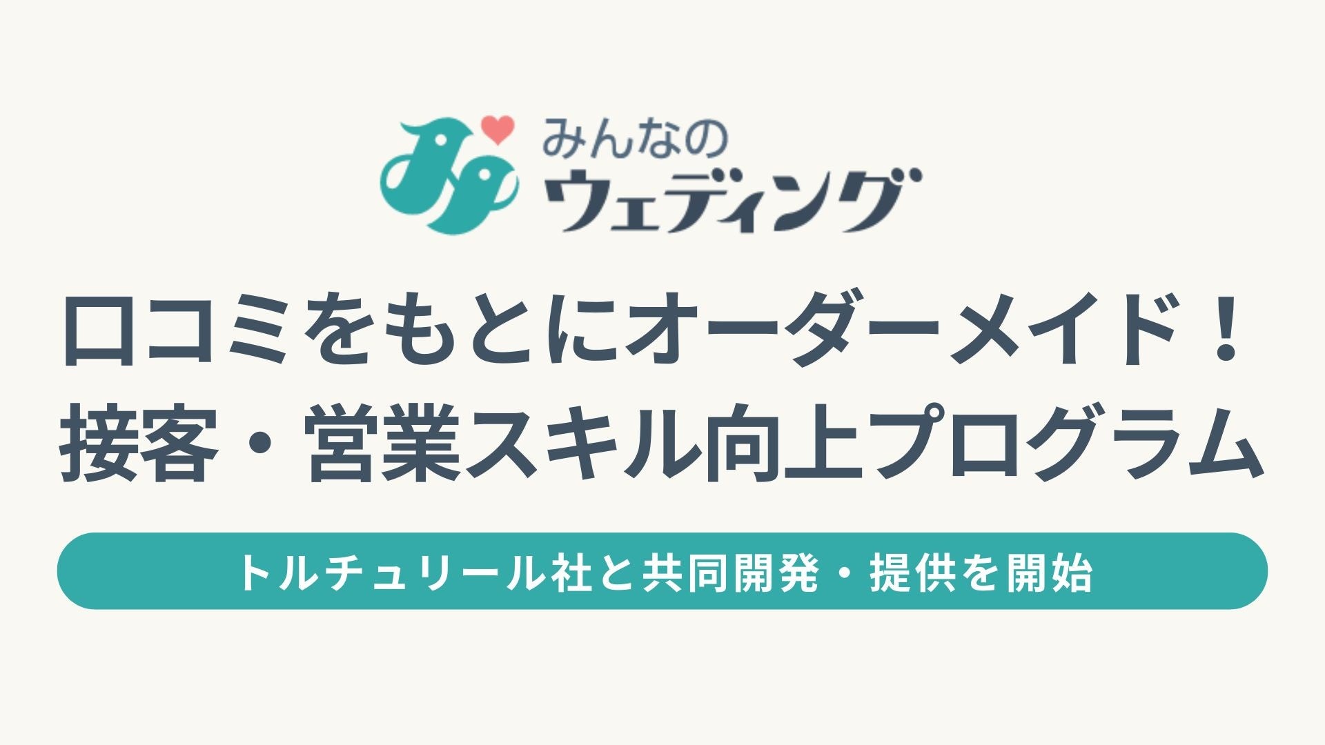 株式会社くふうウェディング(以下、「くふうウェディング」)は、ウェディング総合情報サイト「みんなのウェディング」に蓄積されたユーザー口コミを分析し、その結果をもとにした結婚式場向けオーダーメイド接客・営業スキル向上プログラムを、コミュニケーションに特化した企業の人材教育を行う株式会社トルチュリール(以下、「トルチュリール」)と共同で開発し、提供を開始いたしました。