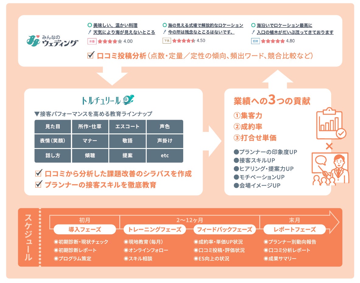これまでも「みんなのウェディング」では、蓄積された口コミデータをもとに営業担当が式場をサポートしてきましたが、このたび、接客スキル改善のプロであるトルチュリールの玉井さんとの連携により、実践的なサポートプログラムの提供が実現しました。