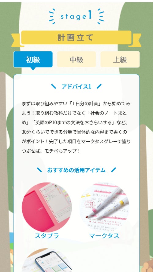各ステージでは、「計画立て」「ノートの取り方」「プリント整理術」などのテーマに基づき、ベネッセの監修による勉強メソッドや、おすすめ文具を知ることができます。また、勉強通話アプリ「StudyCast」と連携し、友達とLIVE勉強会を行うことも可能です。