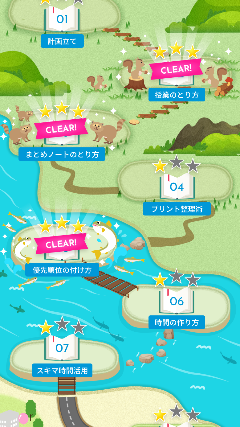 ステージをクリアするために何度も訪れることで、学習の習慣化をサポートします。