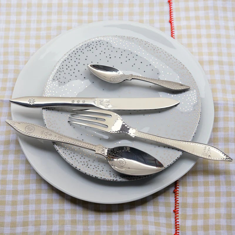 光沢のある型押しステンレス製のカトラリー4本セット。ナイフ、フォーク、スープスプーン、デザートスプーンが付いています。