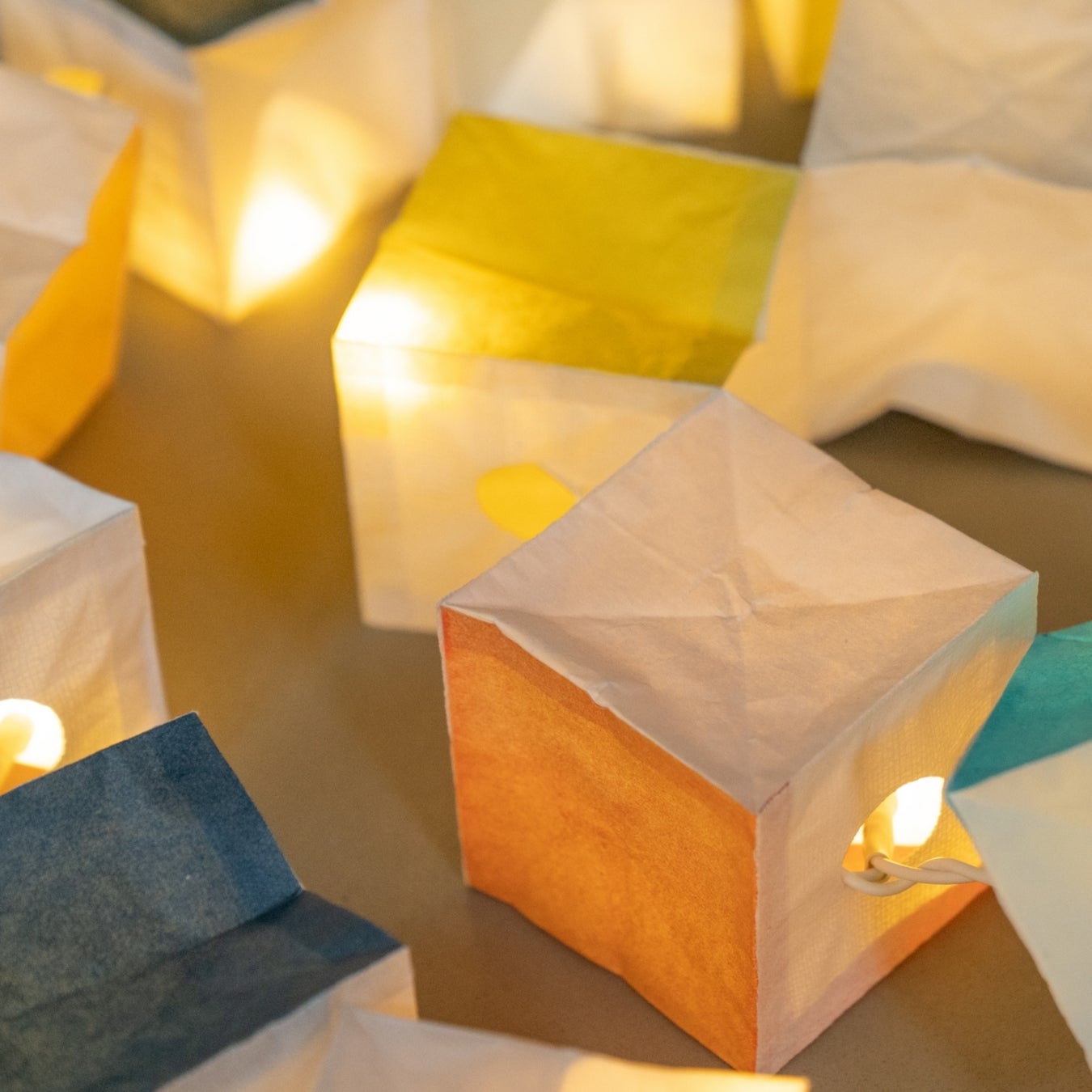 キューブ状に組み立てられた紙製のシェードから柔らかな光が漏れ出す、ツェツェ・アソシエの永遠の定番プロダクトとも言える商品。