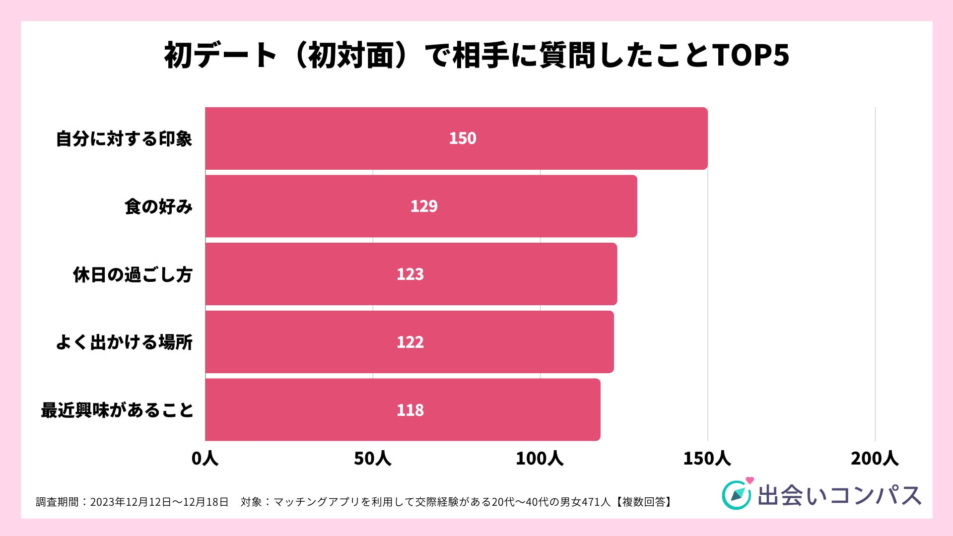 初めて対面した際に質問したことTOP3は、「自分に対する印象(150人)」、次いで「食の好み(129人)」、「休日の過ごし方(123人)」という結果でした。