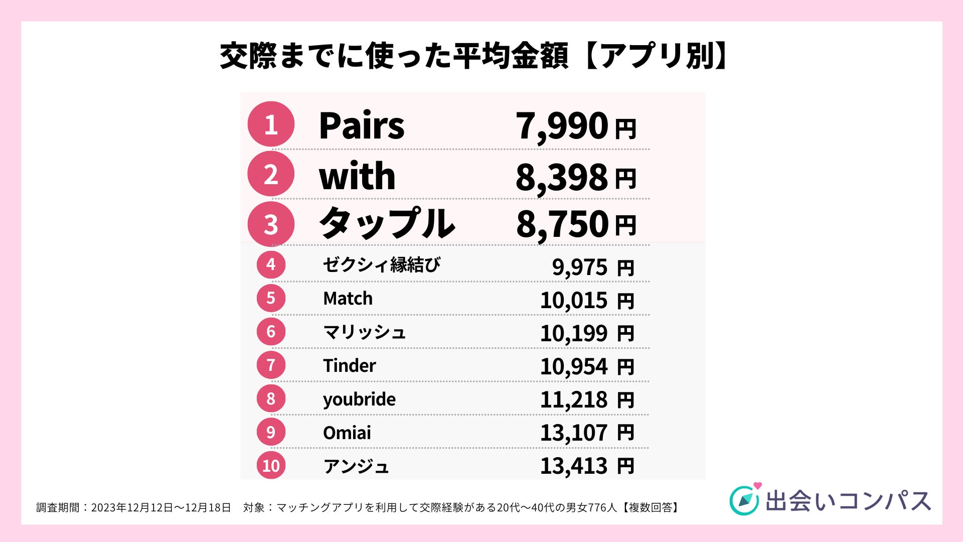 交際までの課金額が最も少ないアプリは「Pairs」で平均7,990円