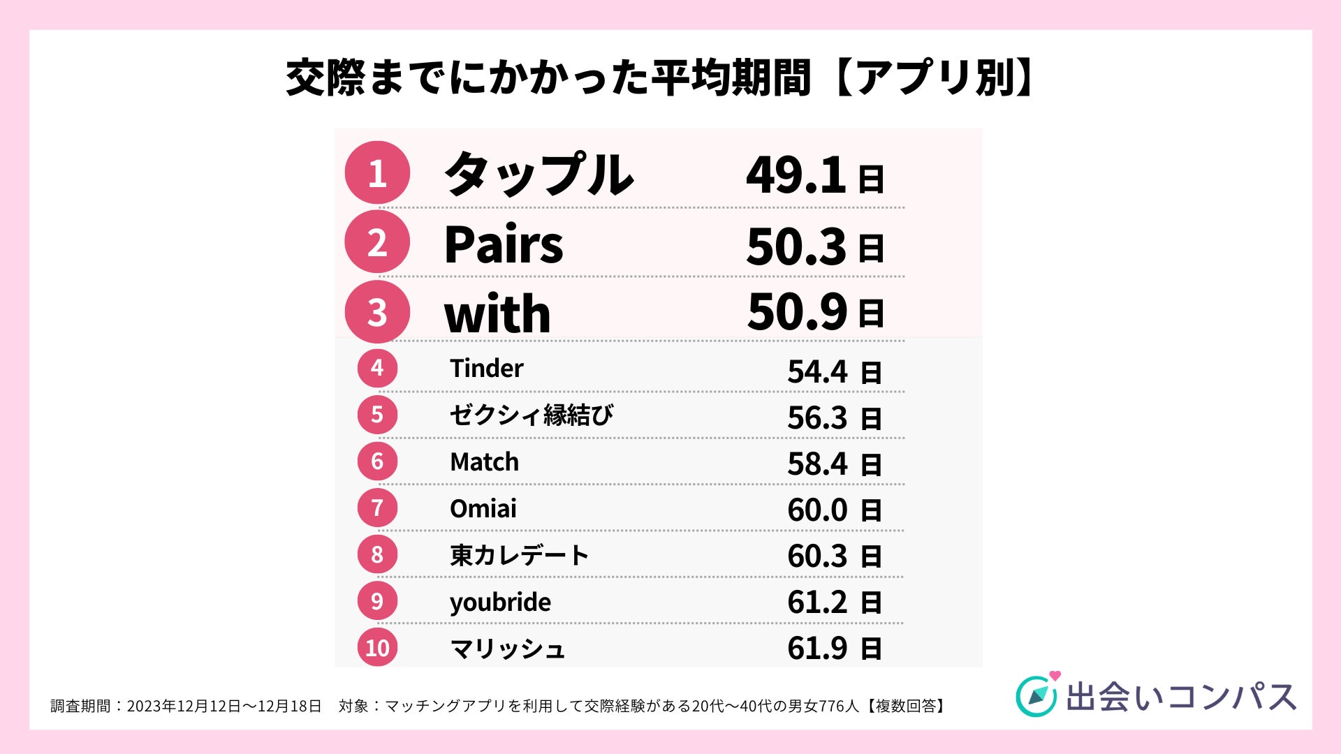 交際までにかかった期間が短いアプリTOP3は「タップル」「Pairs」「with」で平均約50日