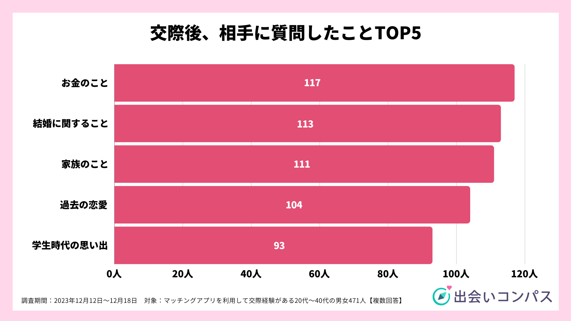 交際した後に、相手に質問したことで最多は「お金のこと(117人)」、次いで「結婚に関すること(113人)」、「家族のこと(111人)」でした。