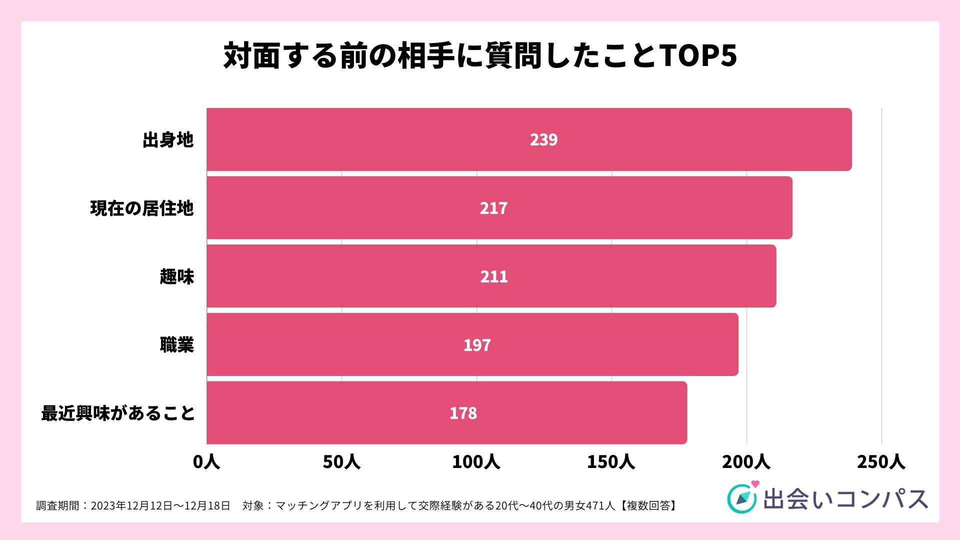 その結果、対面する前に質問した項目で最も多いのは、「出身地(239人)」、次いで「現在の居住地(217人)」、「趣味(211人)」でした。