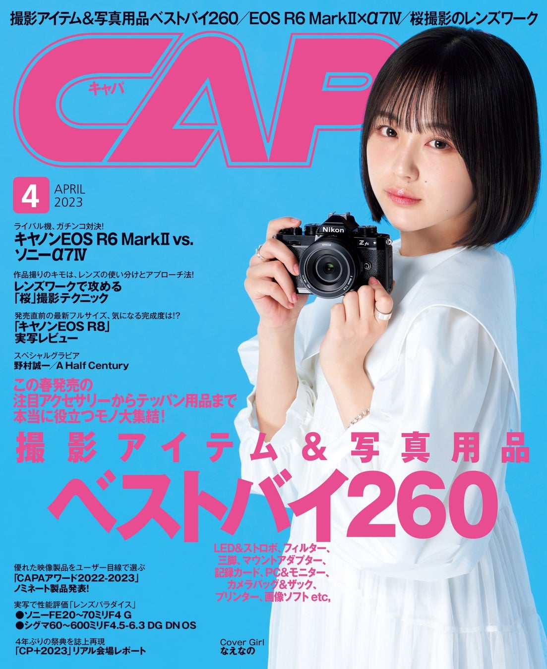 巻頭特集は「撮影アイテム&写真用品 ベストバイ260」。この春の注目商品の紹介はもちろん、プロ写真家の推薦アイテムや選ぶポイントも解説。第2特集は、ライバル機のガチンコ対決「キヤノンEOS R6 MarkⅡ vs. ソニーα7Ⅳ」。画質やAF性能、交換レンズなどを徹底比較します。さらに、「レンズワークで楽しむ 桜撮影テクニック2023」やグラビア界の巨匠・野村誠一さんの作品グラビアもお届け。CAPA4月号もカメラ・写真を楽しむための記事が満載です。