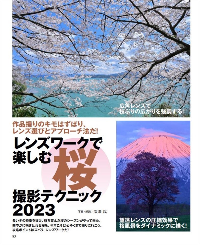 撮影の攻略ポイントはズバリ、レンズワーク! 広角レンズで枝ぶりの広がりを強調したり、望遠レンズの圧縮効果で桜風景をダイナミックに描いたりなど、広角、標準、望遠、マクロ、4つのレンズの使いこなしを紹介します。