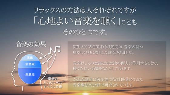アプリRELAX WORLD MUSICは、音楽の持つ癒やしの力に着目して開発されました。