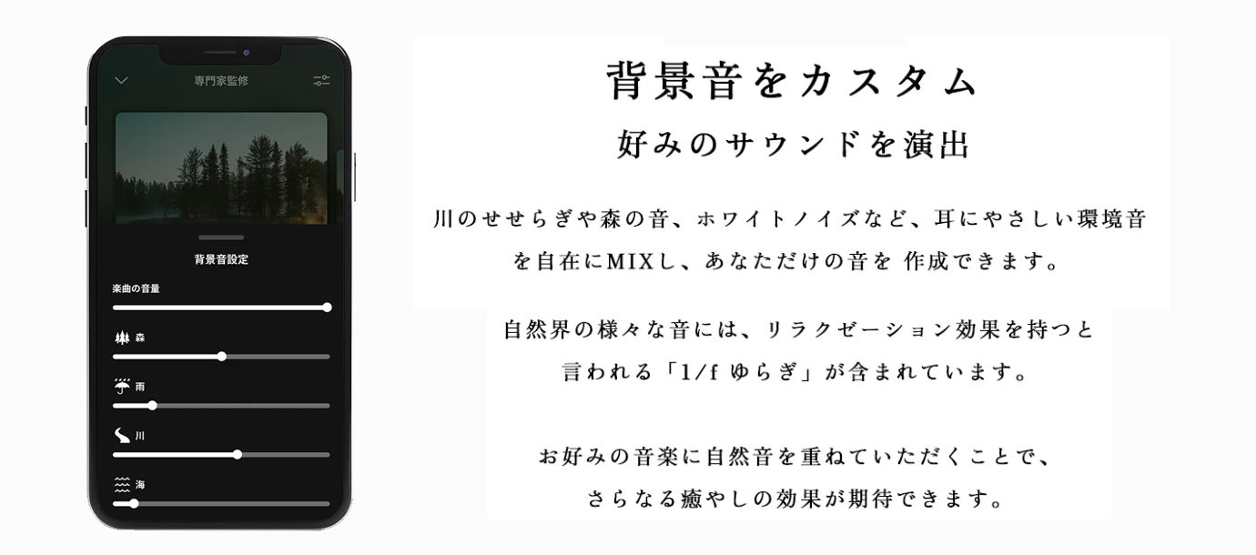 川のせせらぎや森の音、ホワイトノイズなど、耳にやさしい環境音を自在にMIXし、あなただけの音を作成できます。