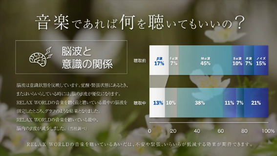 このことから、RELAX WORLDの音楽をかけているあいだは、不安や緊張、いらいらが低減する効果が期待できます。