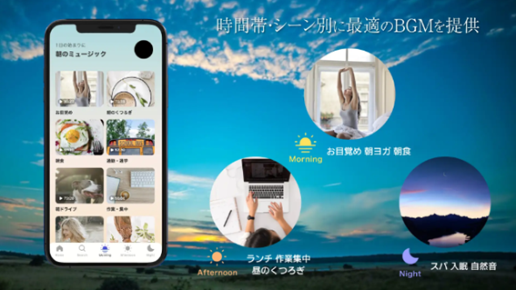「お目覚め」「ヨガ」「自然音」「作業・集中BGM」など、時間帯やシーン別に最適なコンテンツをご用意し、一日の健康とリラクゼーション体験をトータルでサポートします。