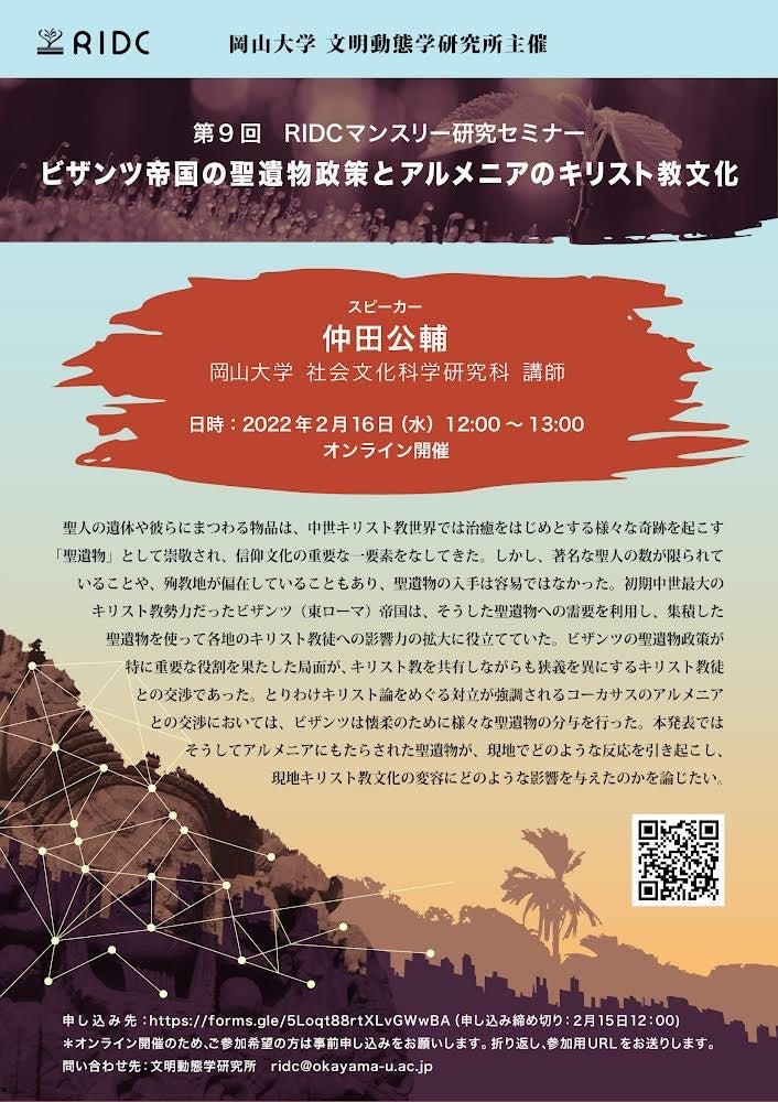 【岡山大学文明動態学研究所】ビザンツ帝国の聖遺物政策とアルメニアのキリスト教文化〔2/16,水 オンライン〕