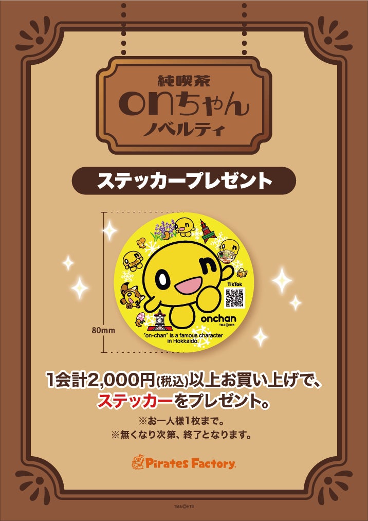 純喫茶onちゃんSHOPでグッズを1会計で2,000円(税込)以上お買い上げいただいた方に、「ステッカー」1枚をプレゼント!