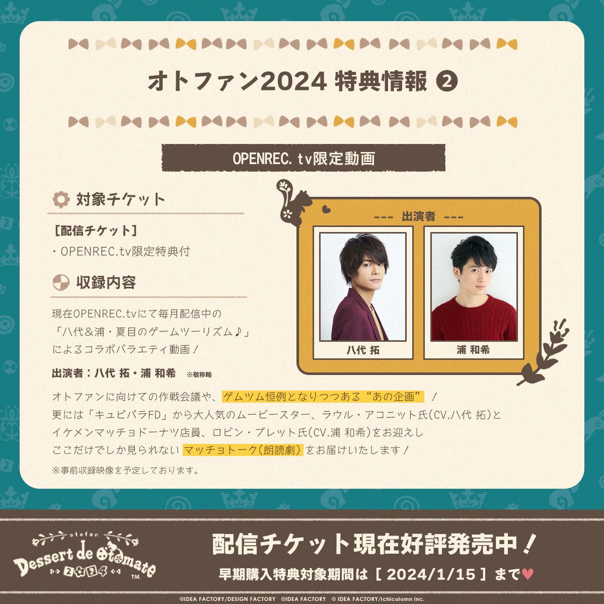OPENREC.tvにて配信中の『八代&浦・夏目のゲームツーリズム♪~Presented by オトメイト~』(通称「ゲムツム」)のサブスク会員になると、期間限定で前回「オトファン2023」で披露した6作品の朗読シナリオ(デジタル版)をご覧いただけます。