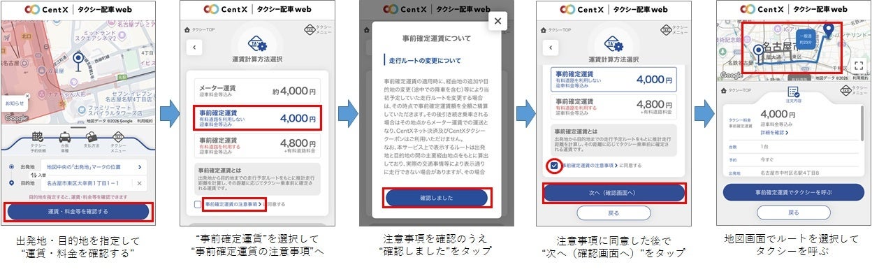CentXタクシー配車機能において、配車依頼時に「事前確定運賃」を選択すると、指定した目的地へのルートと運賃が表示されます。表示されたルートと運賃に同意することで、事前に確定した運賃で安心してタクシーをご利用いただけるようになります。